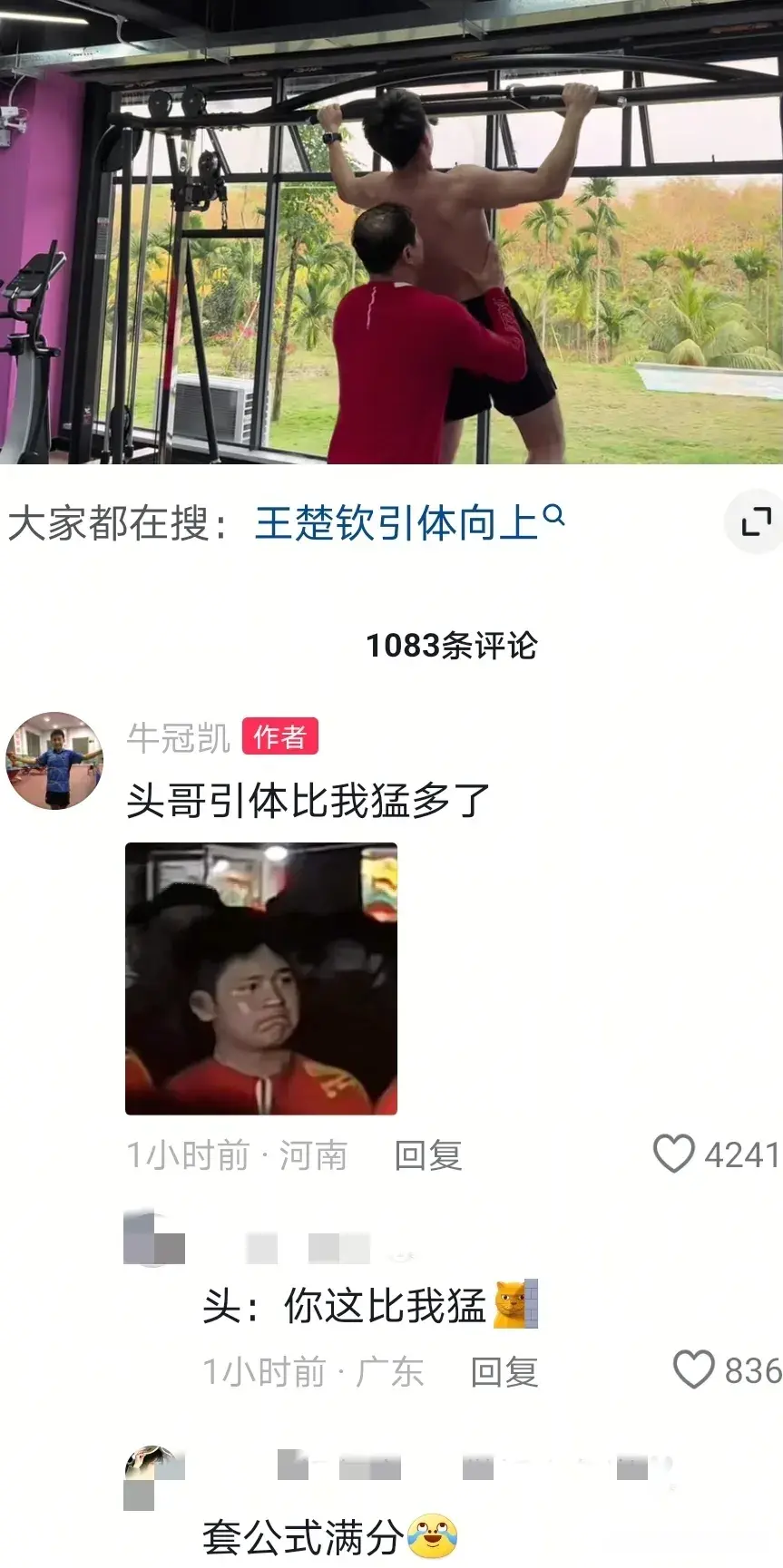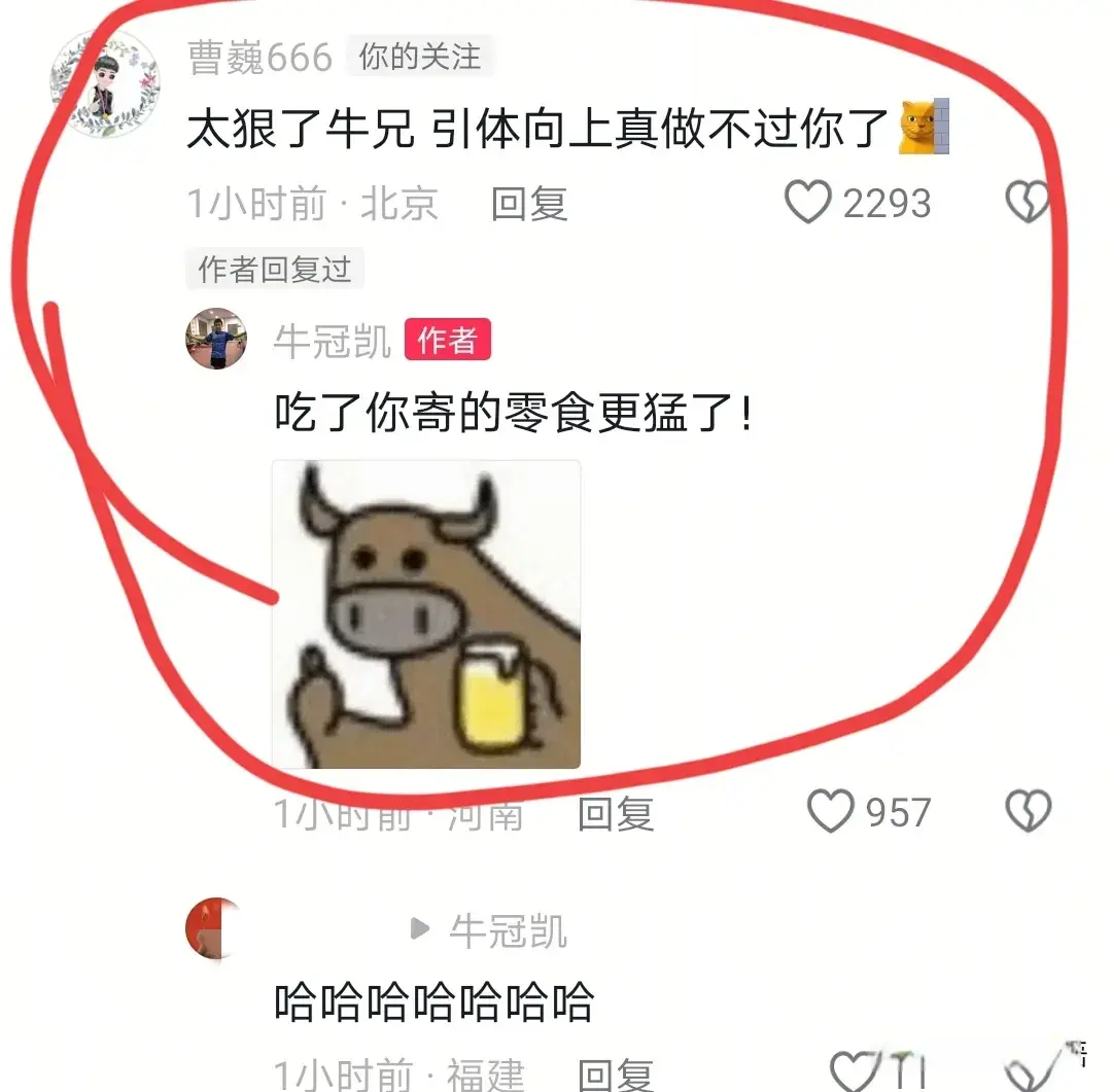 这不,牛冠凯更新抖音后,曹巍来留言:“太狠了牛兄,引体朝上真作念不外你了。”