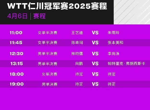 2025年4月6日,乒乓球仁川冠军赛行将遣散,半决赛和决赛被安排合并天进行,国乒三东说念主向鹏、王艺迪、陈幸同冲击单打冠军,其中年青选手向鹏是男队独一的但愿,背面还有两说念难关要过。