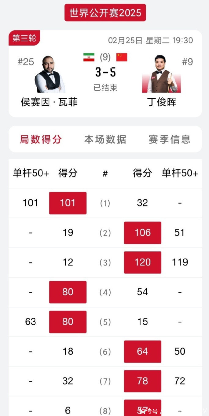 接下来的比赛中体育录像/图片,丁俊晖强势发力,他连赢五局,总比分5-2冒昧慑服乔-佩里晋级32强。第三轮,丁俊晖的敌手是伊朗选手瓦菲-阿尤里,后者在上一轮以5-4险胜袁想俊。这场比赛可谓一波又起,丁俊晖开局造作较多,2-3逾期。接下来的比赛中,他打出一波3-0攻势,总比分5-3逆转晋级,祝愿丁主任!