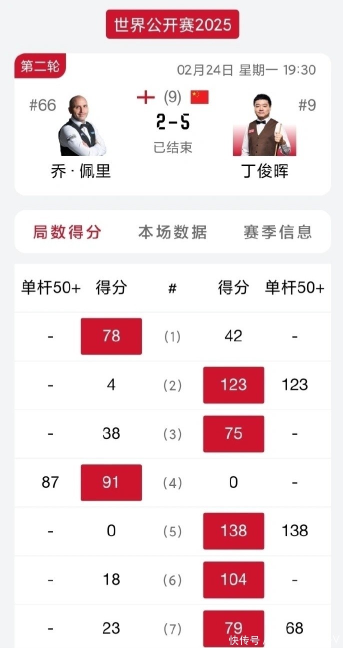 第三局,丁俊晖通过几次上手,75-38再胜一局,2-1反超比分。第四局,乔-佩里打出单杆87分,91-0零封丁俊晖,比分酿成了2-2,两边回到消除谈跑线。