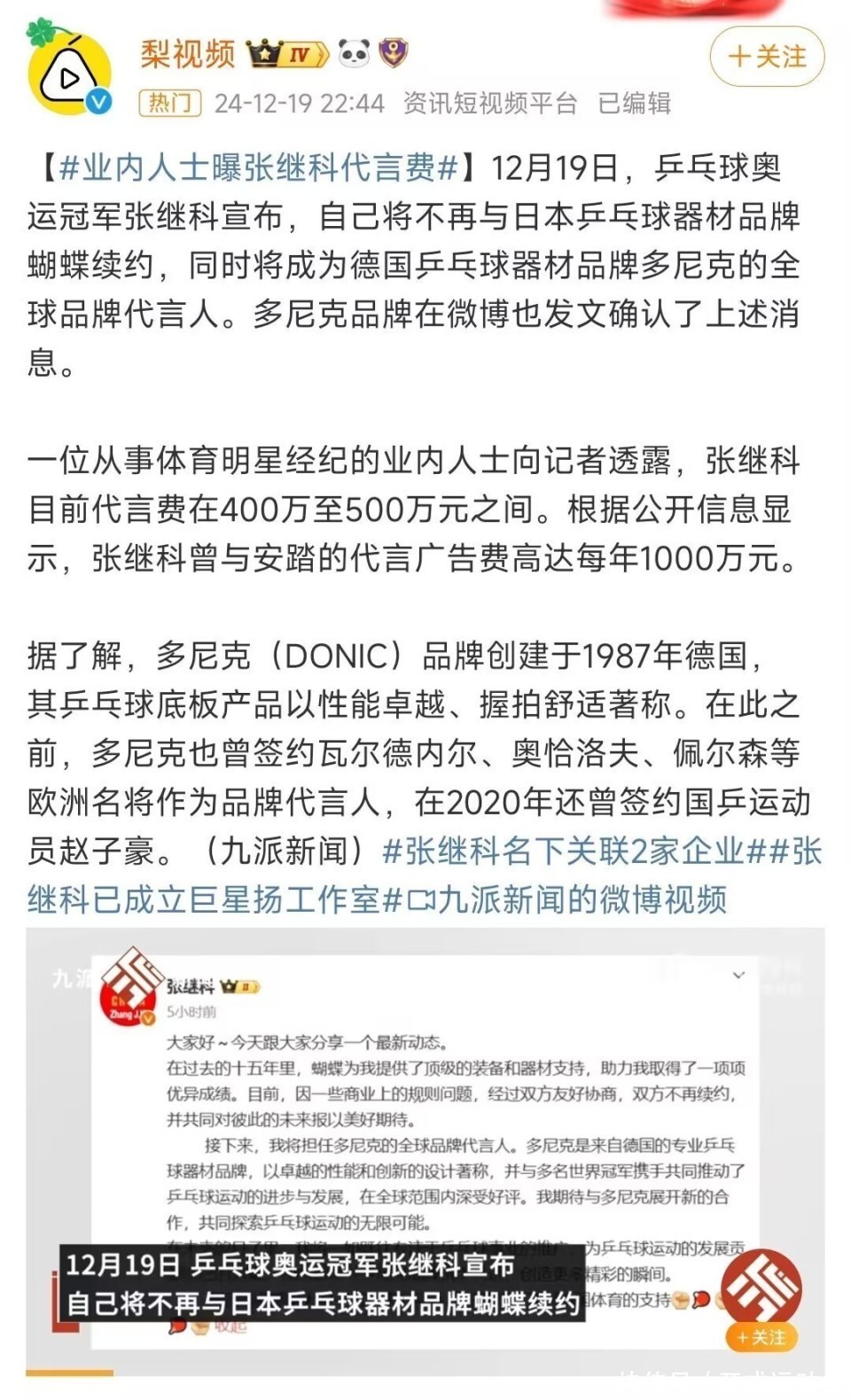 回到12月19日,张继科不再与日本乒乓球器材品牌蝴蝶续约,同期,张继科通获胜为德国乒乓球器材品牌多尼克的天下品牌代言东说念主。