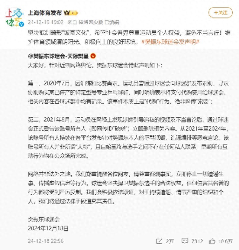 12月18日晚间,樊振东球迷会@樊振东球迷会-天空樊星 在支吾媒体上发布声明。12月19日,@上海体育发布 转发该声明并配文暗示:“坚韧约束无理‘饭圈文化’,但愿社会各界尊重畅通员个东说念主职权,幸免欠妥言行!爱戴体育限制晴明阳光、积极朝上的讲求环境。”@樊振东球迷会-天空樊星在声明中暗示:第一,2020年7月,因历练和比赛需求,畅通员曾通过球迷会向球迷群发布求援,寻求协助购买某已停产的特定型号专科乒乓球鞋,同期明确暗示将支付代购用度给球迷会。筹办内容在各球迷群中均有记载。该事件践诺上是“代购”动作体育赛事直播,绝非网传“索求”;第二体育赛事直播,2021年8月,畅通员在网罗上发现涉嫌开采追私的视频及欠妥言论后,通过球迷会郑重警告该账号扫数东说念主(即网传ID“破晓”)立即删除筹办内容。从2021年至2024年,该账号扫数东说念主执续在各平台发布针对樊振东本东说念主的口角谩骂、训斥编排等坏心言论。该账号扫数东说念主并非所谓“大粉”,且彻里彻外与选手之间不存在职何私东说念主筹办,早期扫数互动动作均在公众时局完成。声明终末称,网罗并不法外之地。请尊重客不雅事实,立即罢手一切训斥滋事、传播演叨信息等动作。球迷会坚韧捍卫樊振东选手的正当职权,任何侵害其名誉的动作齐将受到严厉反制。咱们会积极照章取证,关于执续训斥、情节严重的组织和个东说念主,咱们将通过法律技艺根究其包袱。